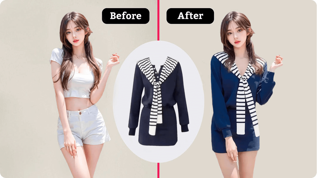 使用AI换衣技术进行虚拟试穿,生成逼真的服装上身效果图,支持任意人物形象穿搭展示,并可上传图片自由混搭服饰,打造个性化造型。