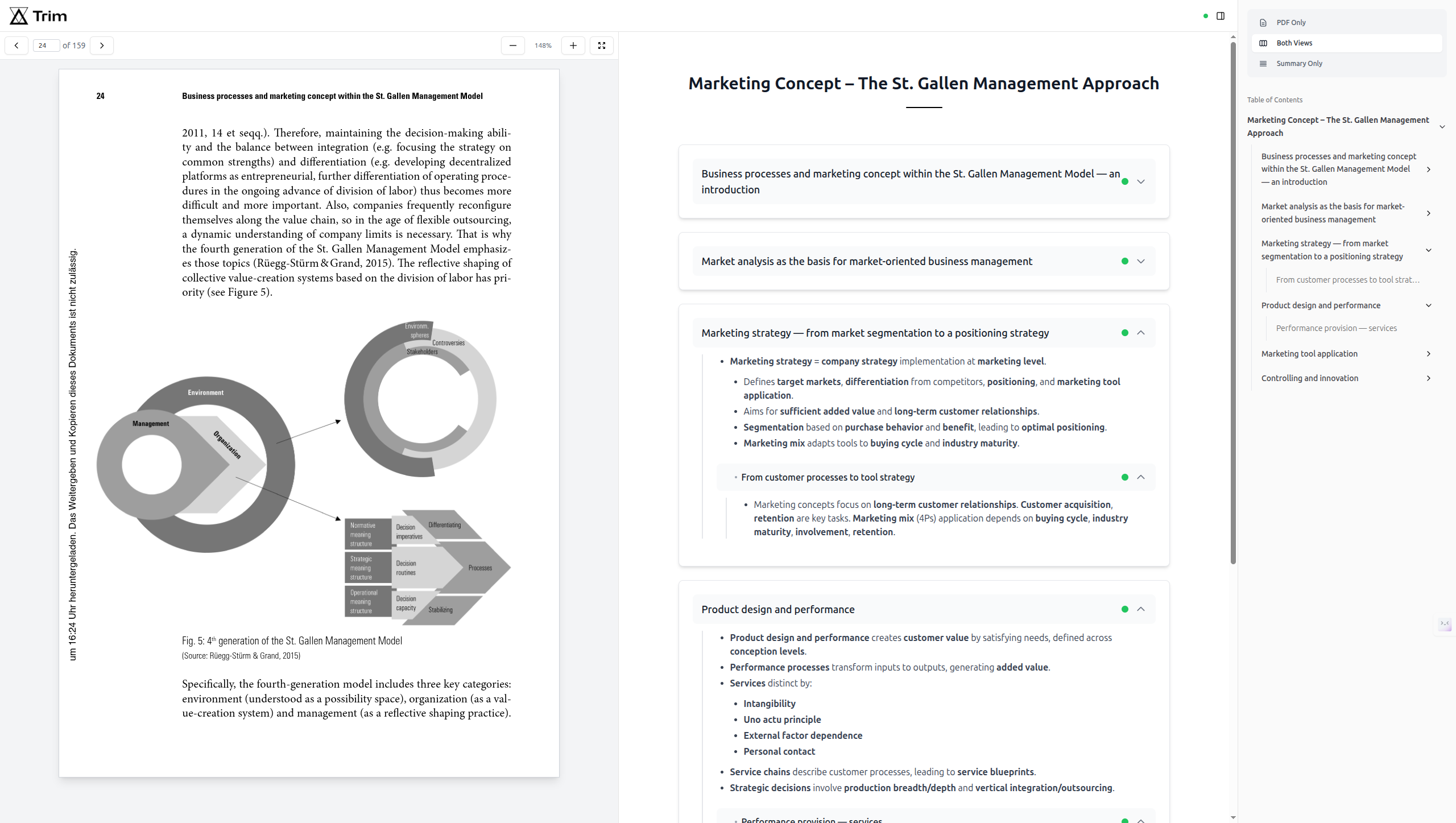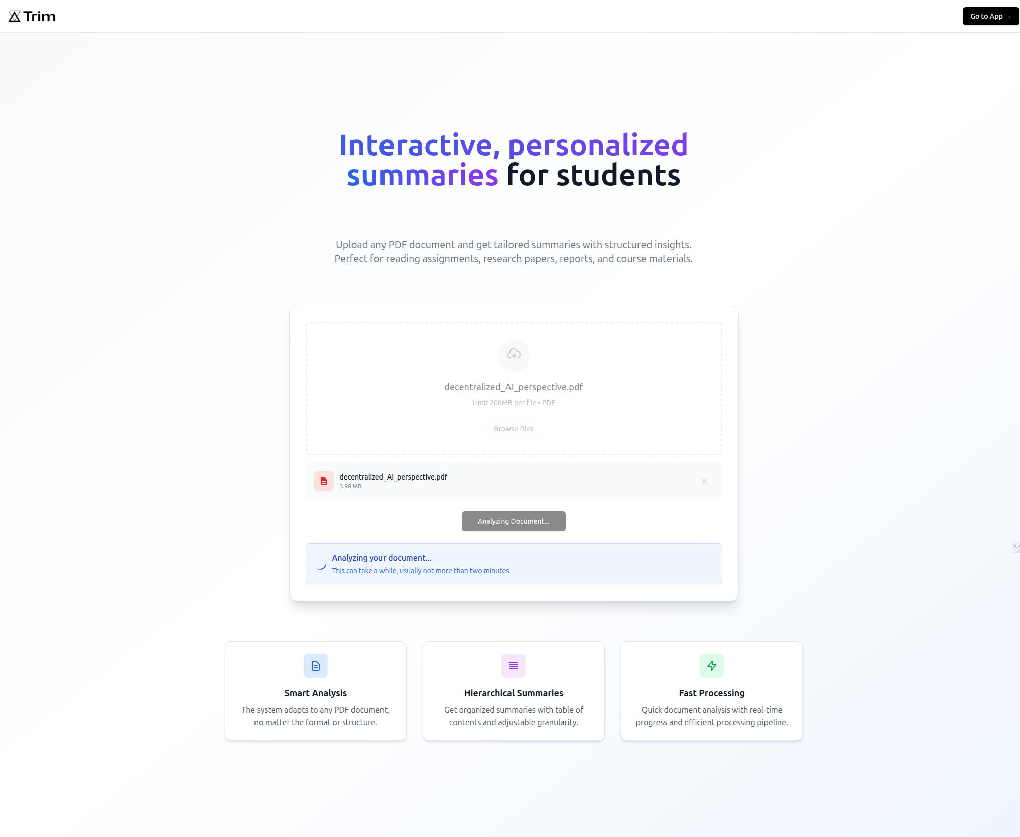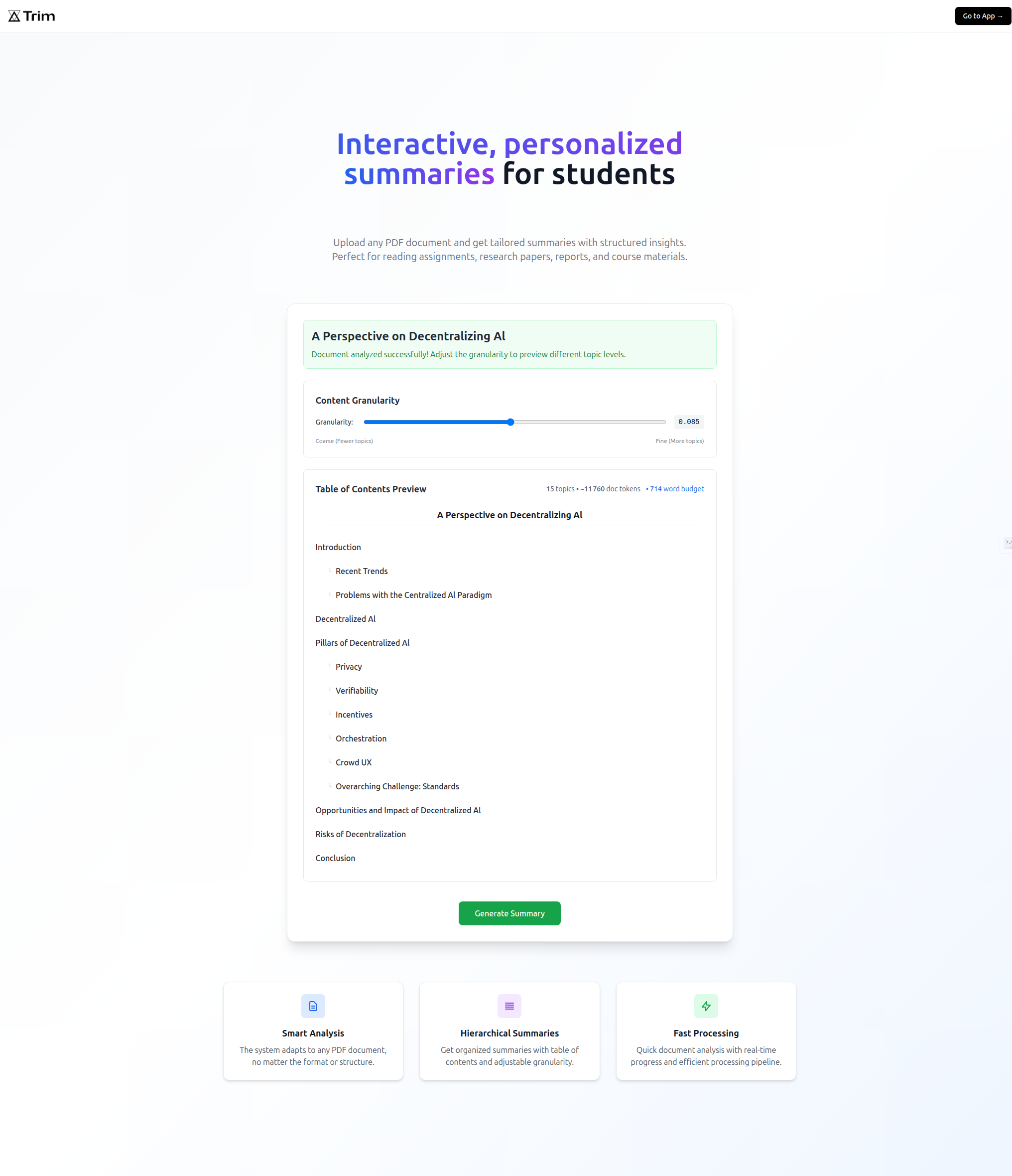 Trim is an application for university students that automatically generates summaries of entire lectures to help students excel at their finals. The summaries are customizable and are presented in an interactive, visual hierarchy for maximum clarity.