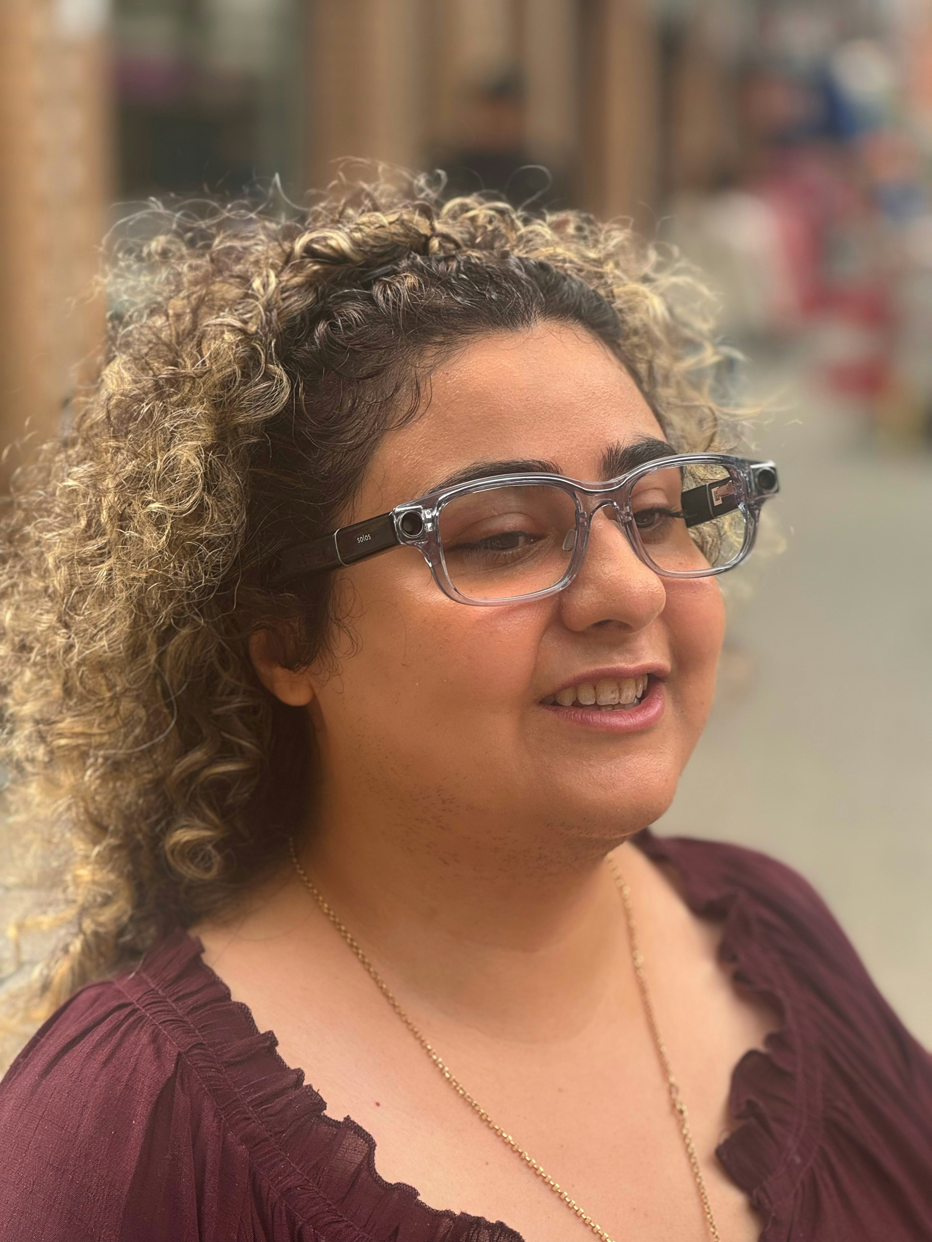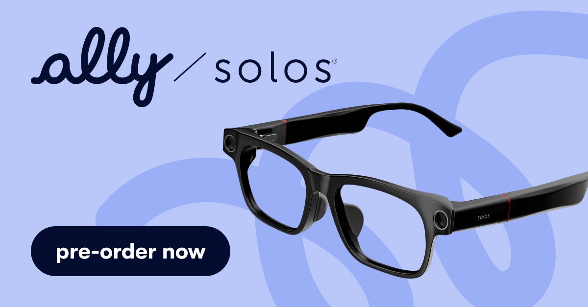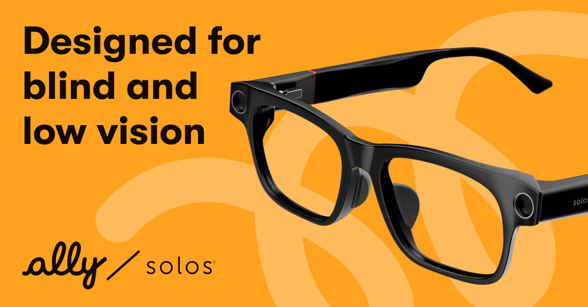 Ally Solos Glasses: lightweight smart glasses with a camera, powered by Ally, the most accessible AI assistant, designed for blind and low vision. Interact with your environment, read menus, and recognize objects, people, and more — just by talking.