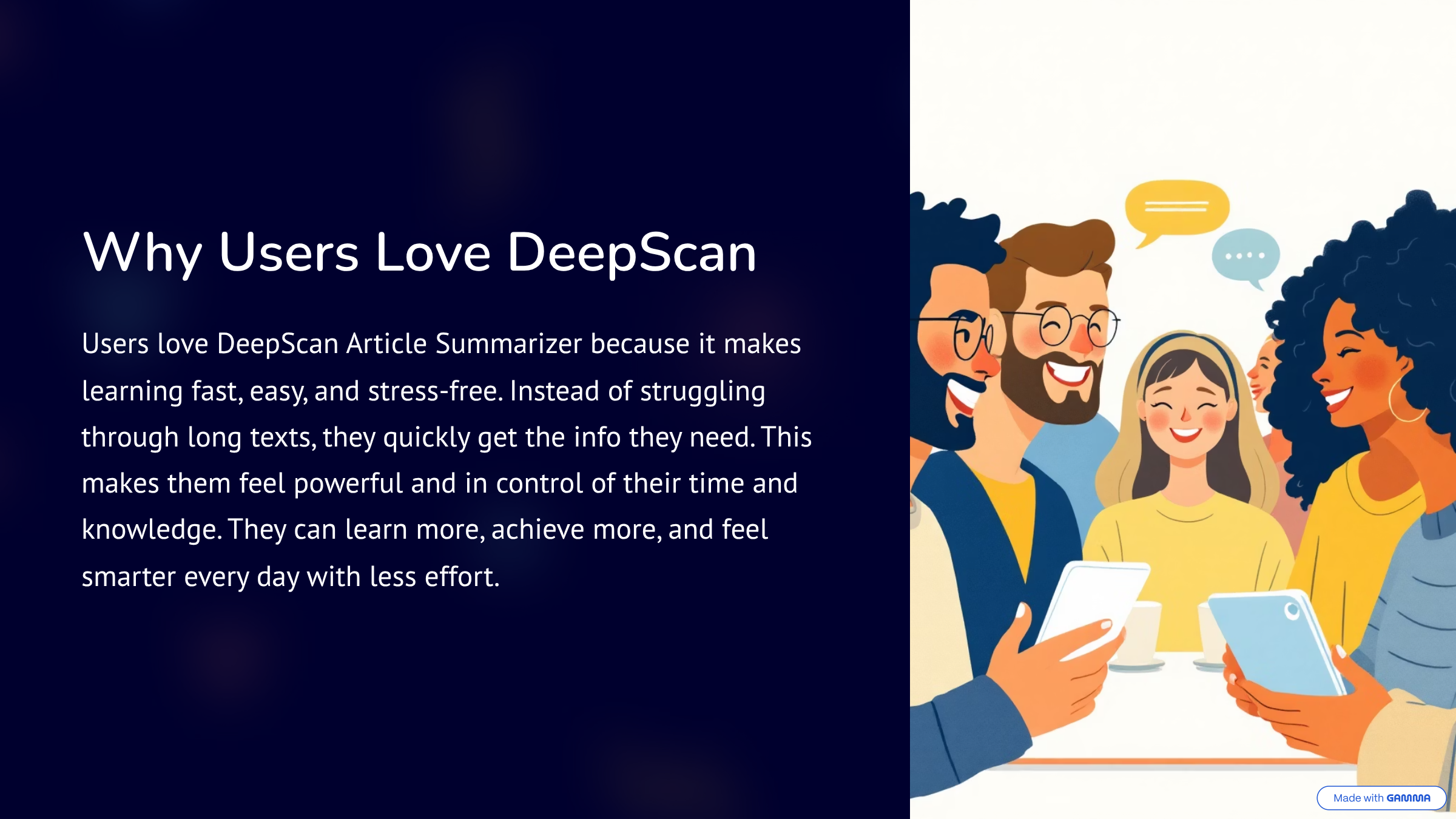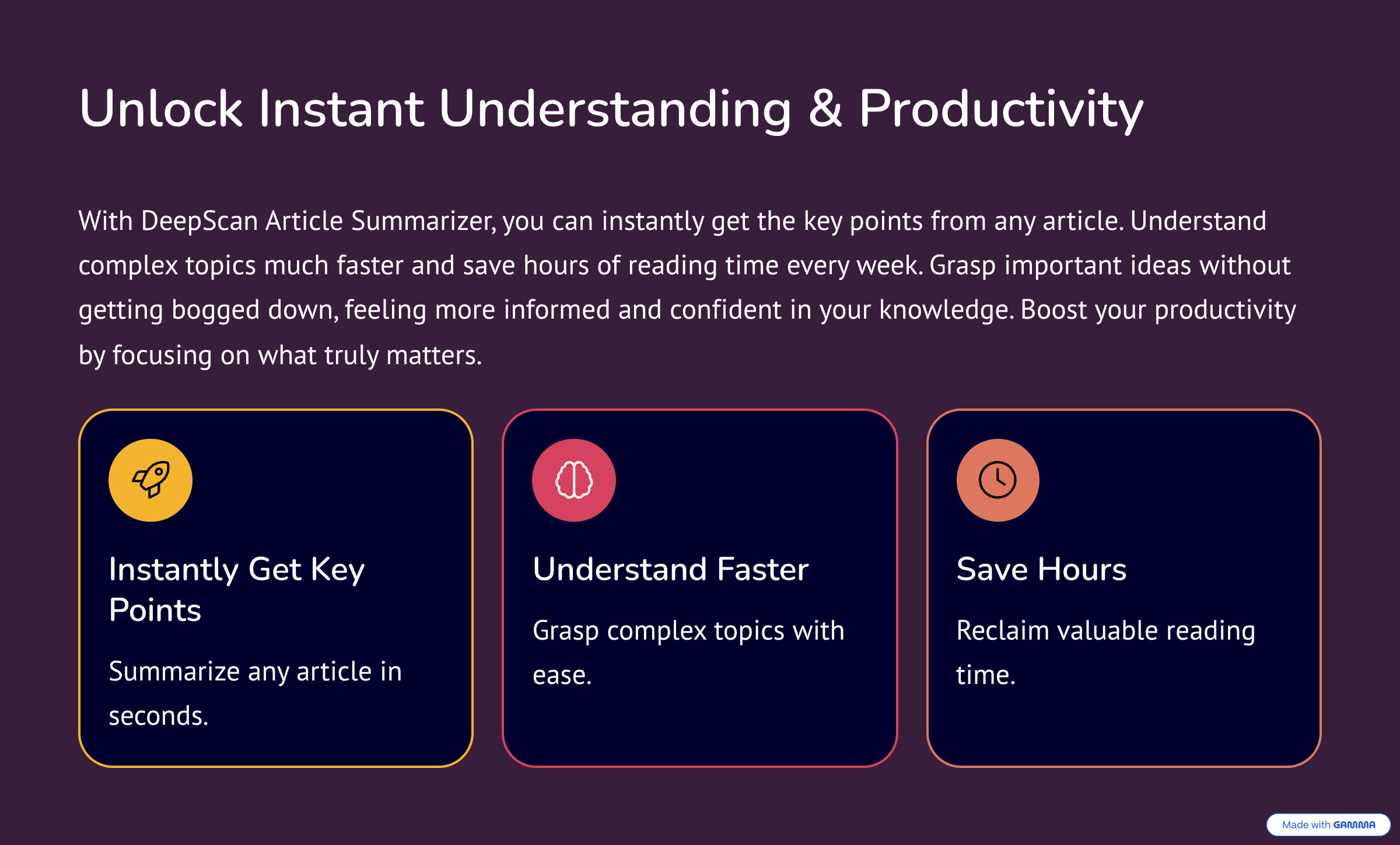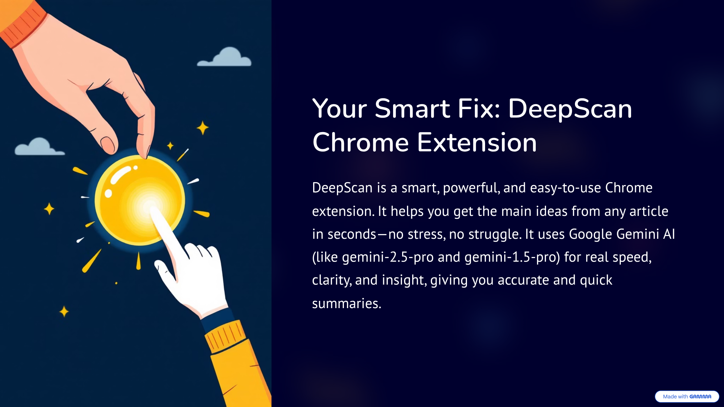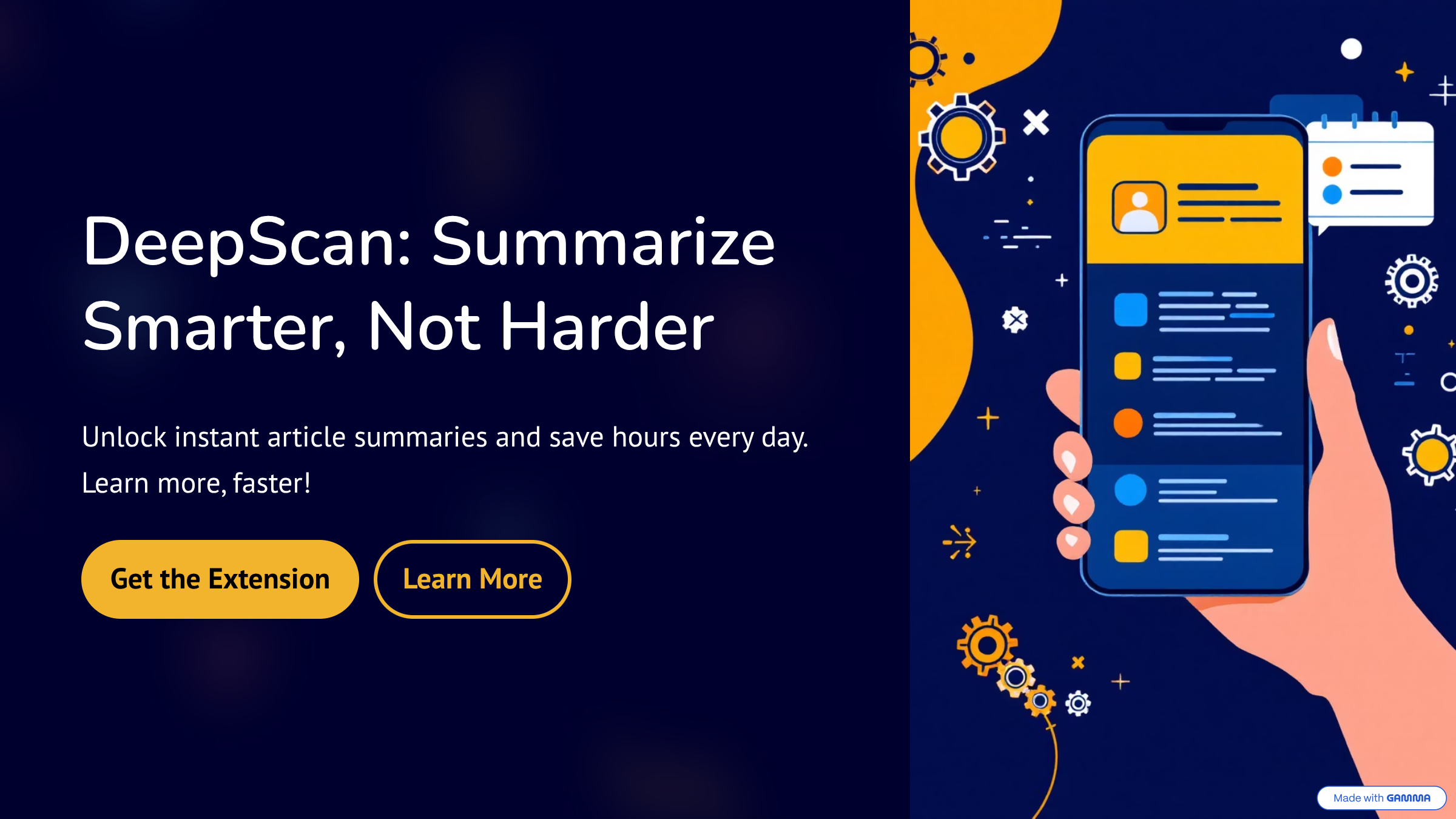 DeepScan Article Summarizer cuts through the noise—just click and get the key takeaways from any article, instantly. Powered by Gemini AI, it helps students, pros, and researchers learn faster, save time, and stay sharp without wading through walls of text.