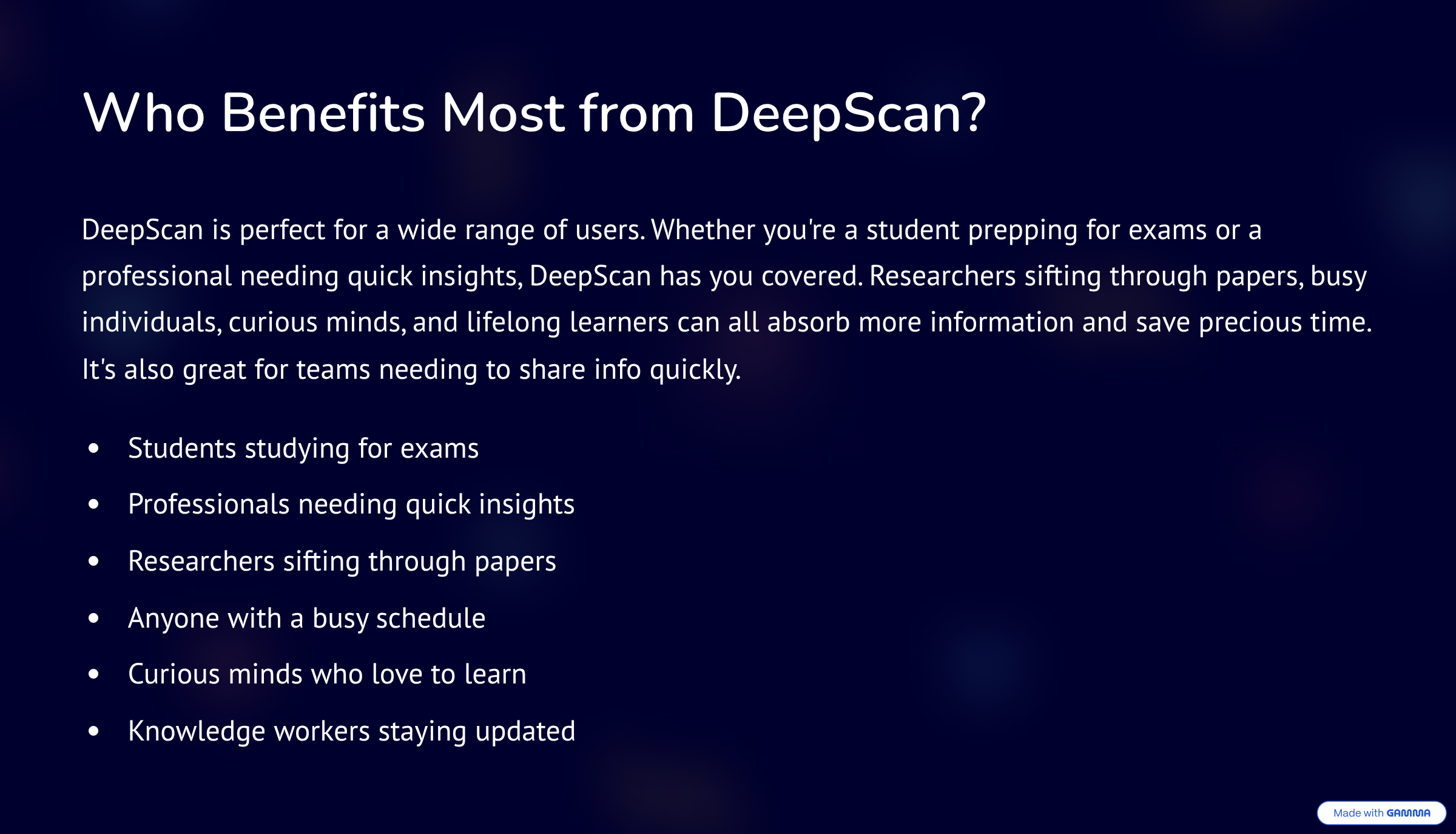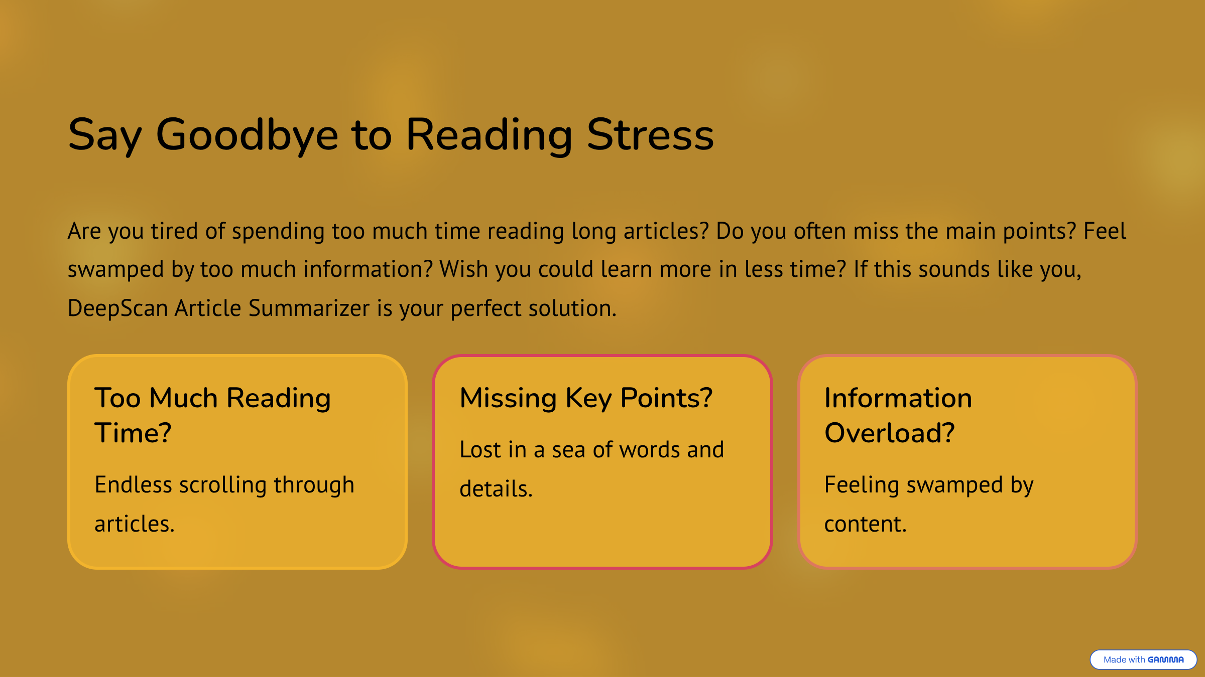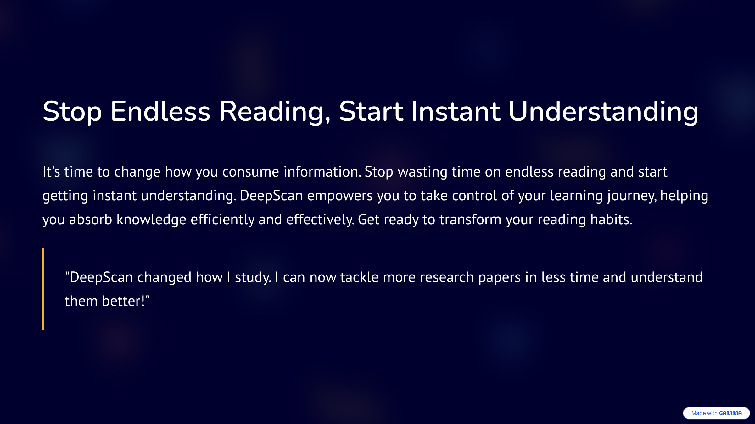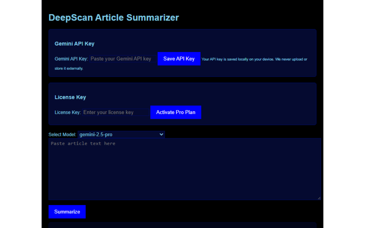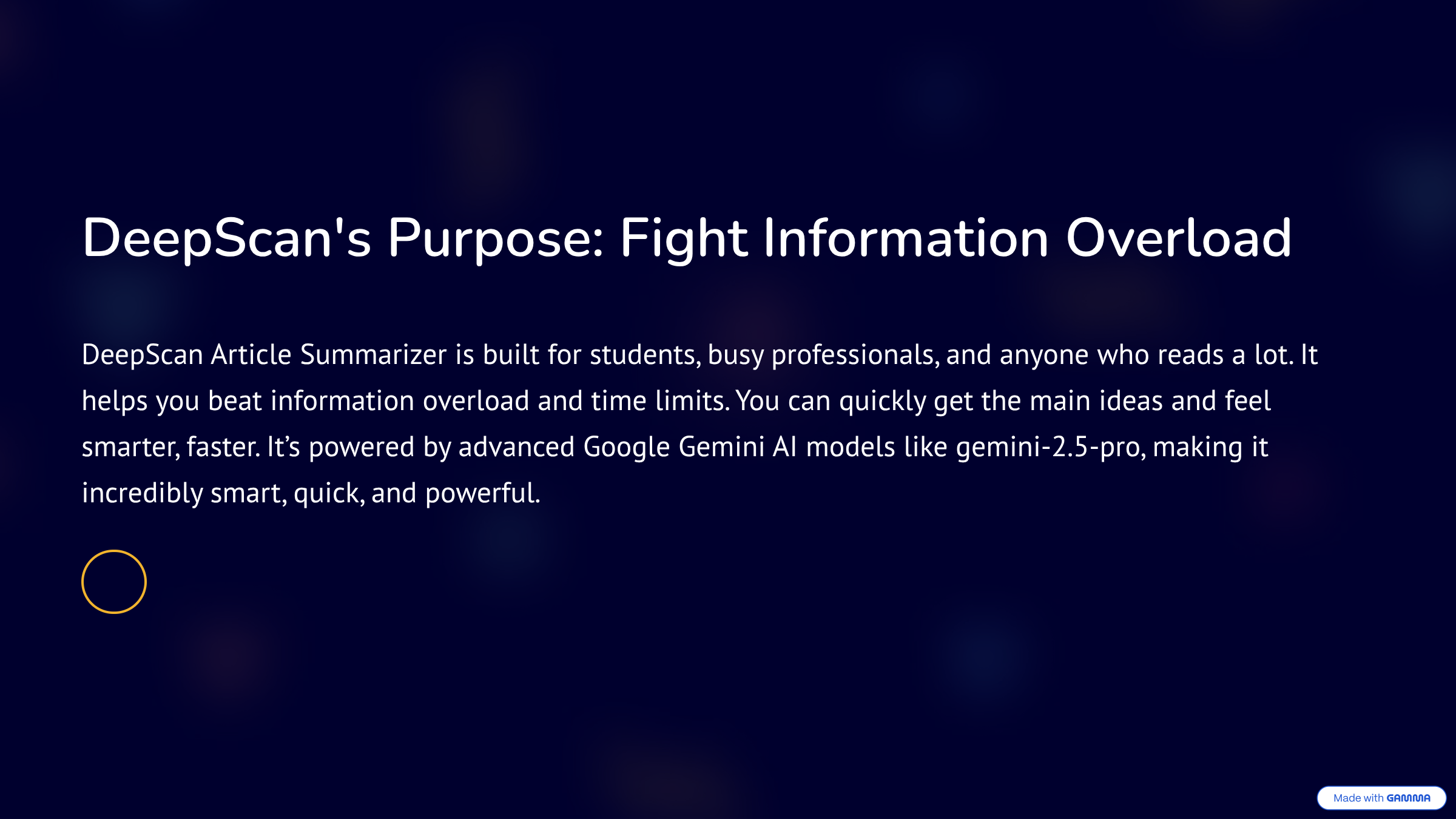 DeepScan Article Summarizer cuts through the noise—just click and get the key takeaways from any article, instantly. Powered by Gemini AI, it helps students, pros, and researchers learn faster, save time, and stay sharp without wading through walls of text.