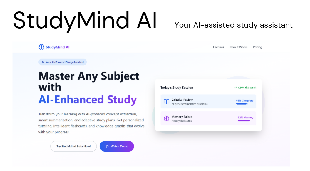 StudyMind AI helps you master any subject with AI-powered concept extraction, smart summaries, adaptive study plans, intelligent flashcards, and evolving knowledge graphs — all built into a powerful, Markdown‑ready study workspace.