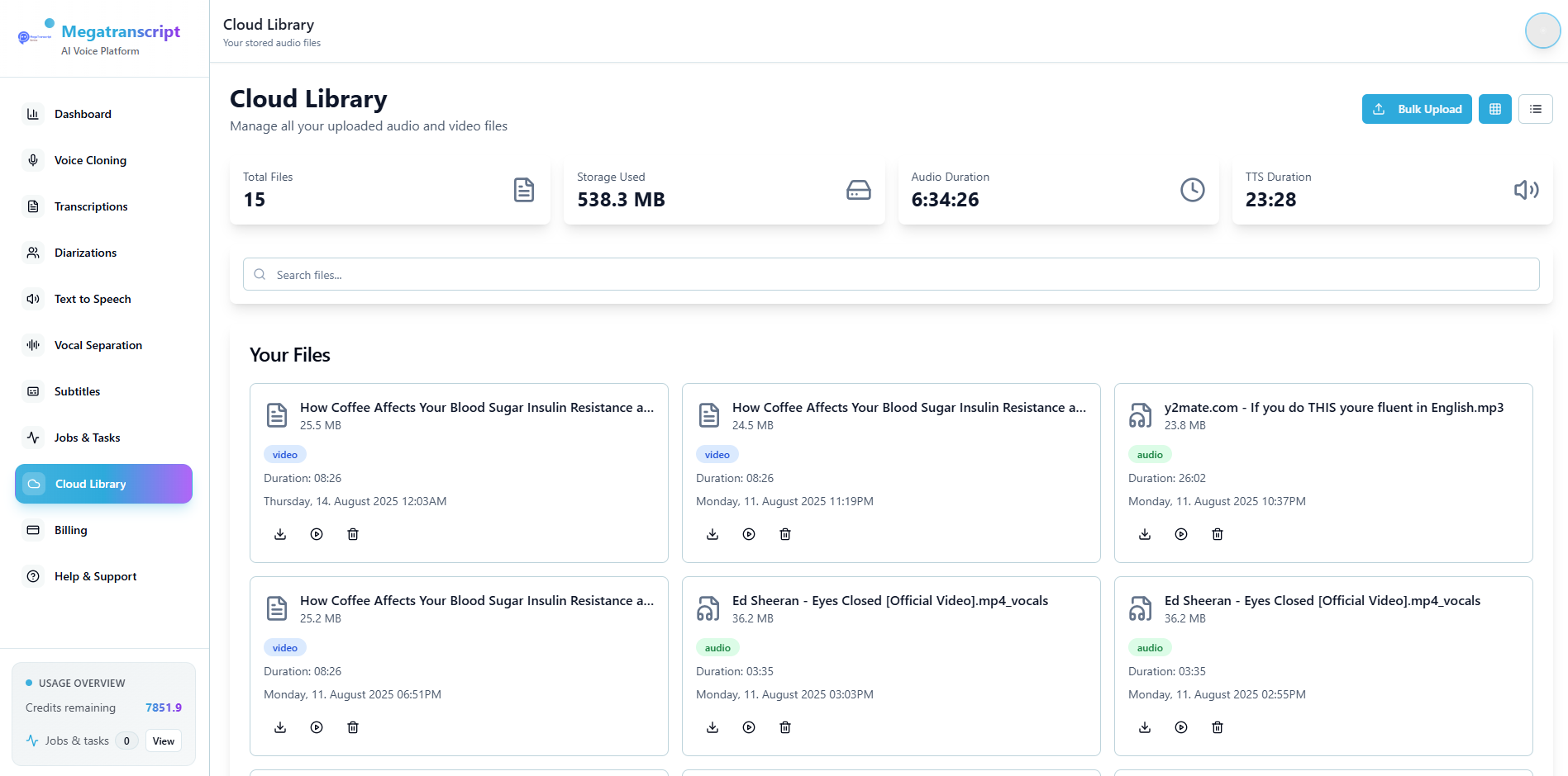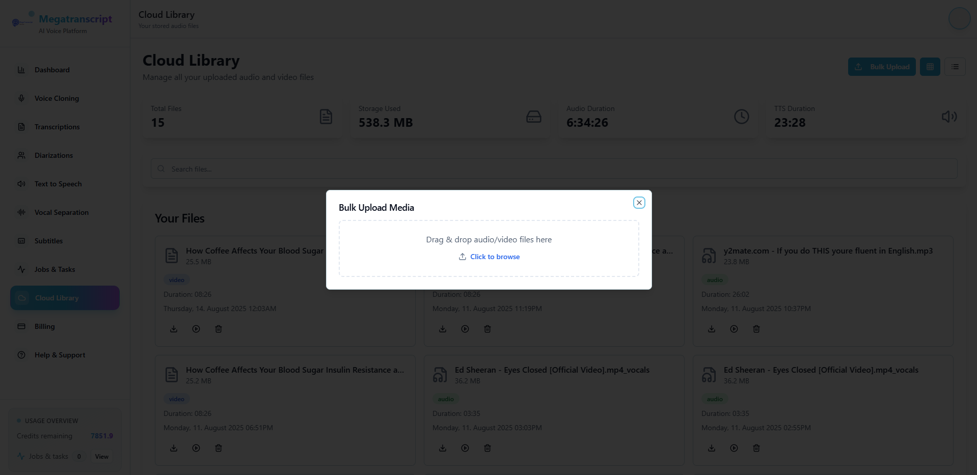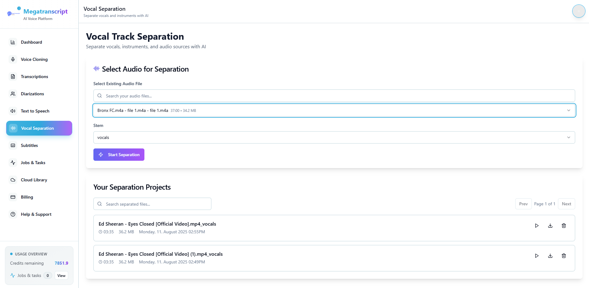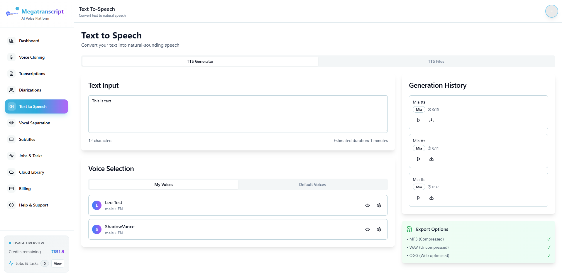 MegaTranscript —— 专为创作者和团队打造的AI转录、字幕生成、说话人分离、文本转语音、声音克隆及人声分离解决方案。