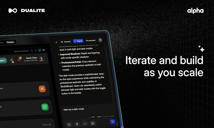 Dualite allows you to build and ship full-stack mobile and web applications securely by prompting. Simply describe what you want to build, and it will build it for you, all while keeping your data and sensitive keys securely.