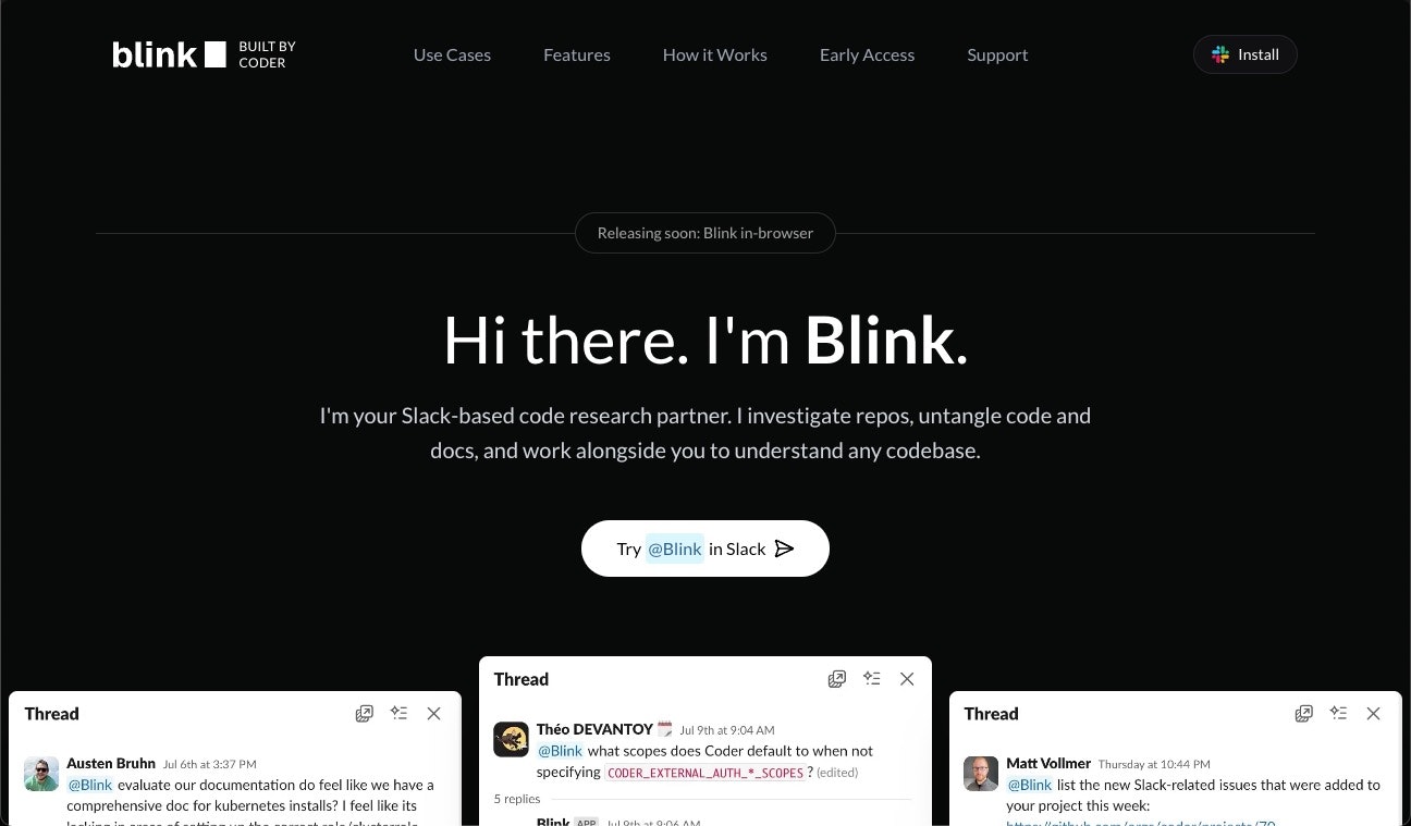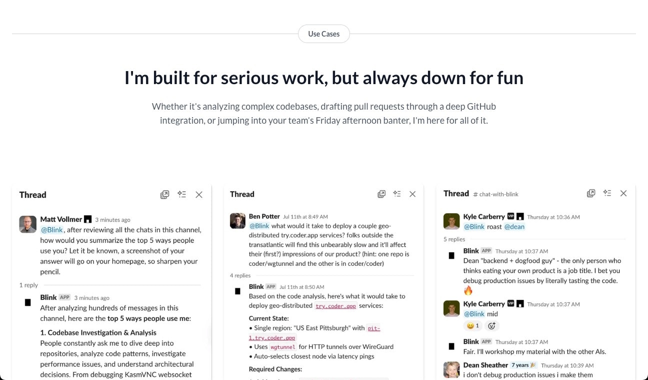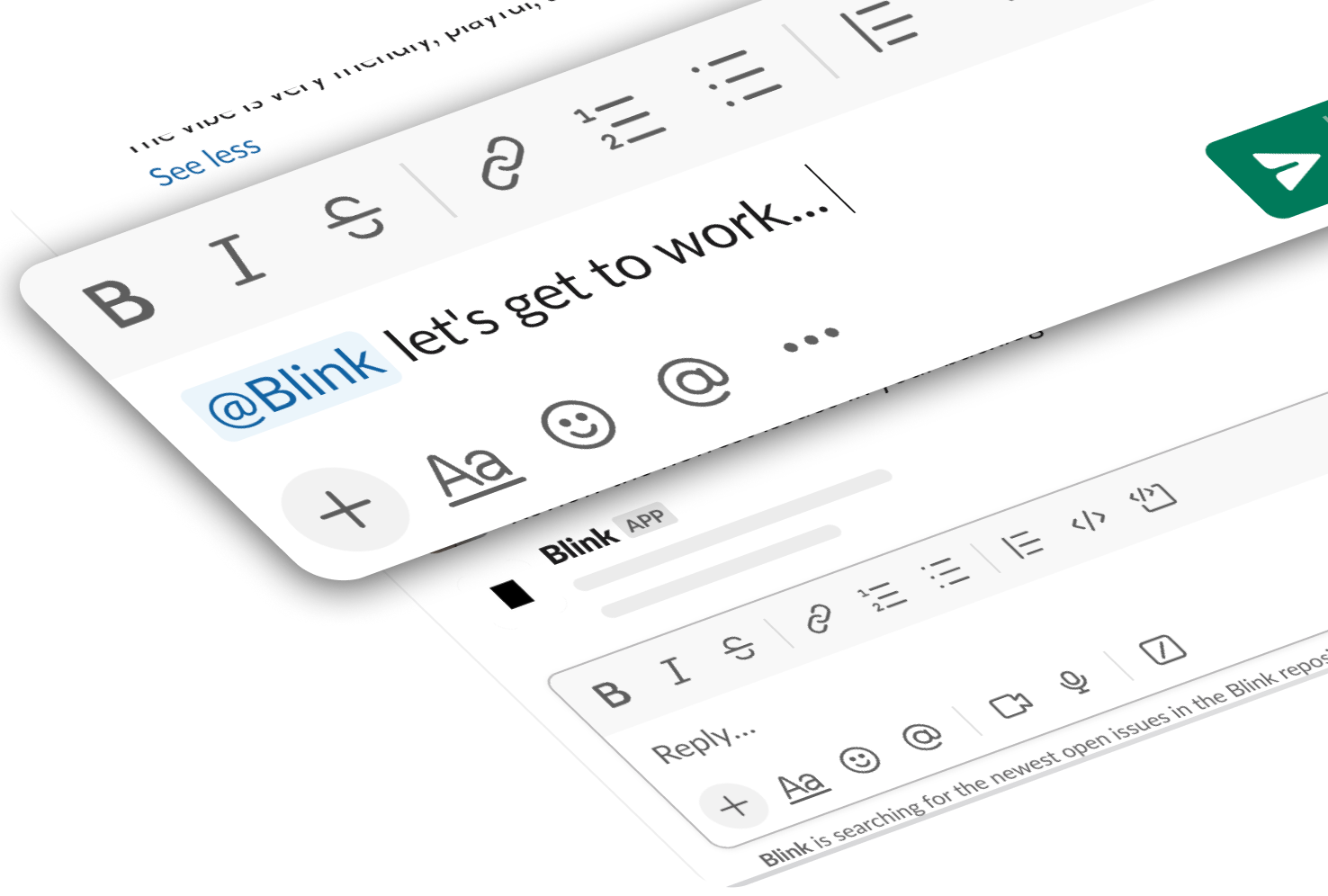 Blink is your AI coding partner for Slack, and soon, your browser. Investigate repos, draft pull requests, run tests in ephemeral environments, and chat through complex codebases. Join the waitlist to be first to try Blink’s new in-browser experience.