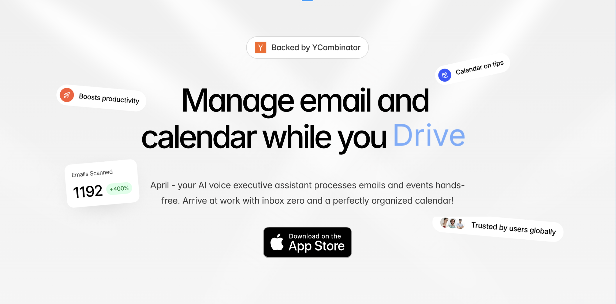 April is a voice AI Executive Assistant that manages your email and calendar handsfree. Built for busy individuals who need an EA. Using just your voice you can ask April to reschedule meetings, delete junk email and respond to emails that matter.