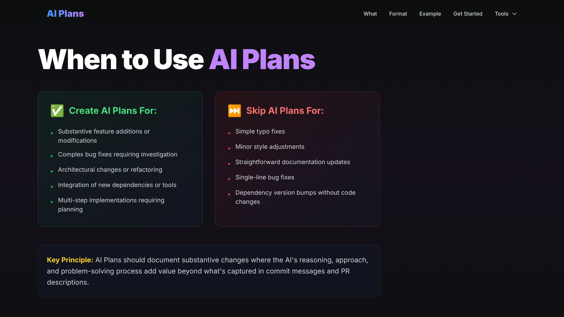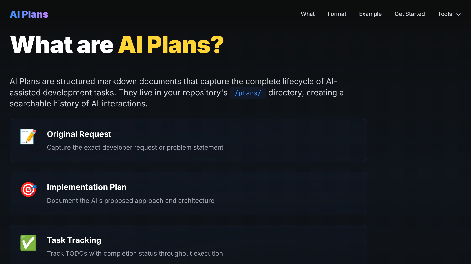 AI Plans capture the complete context of AI-assisted development in markdown files. Track requests, implementation strategies, task breakdowns, and issues encountered. Create a searchable history of AI interactions in your repo's /plans/ directory.
