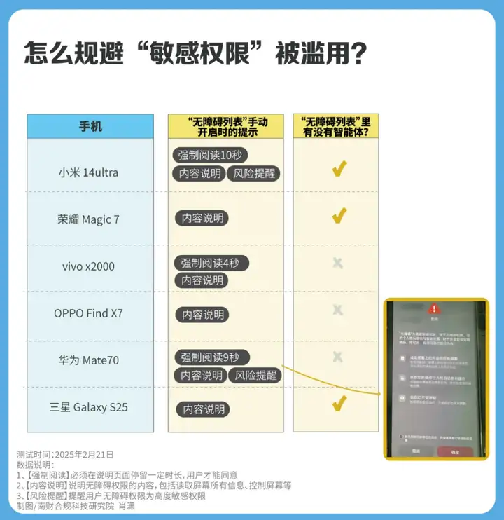 技术狂飙的背后,隐忧悄然浮现。尽管AI还未实现“全自动驾驶”手机的理想形态,但南财合规科技研究院、21世纪经济报道实测发现,多款手机智能体在后台打开了手机的无障碍权限,部分未事先通知用户。这一功能原本是为残障人士设计的“特殊通道”,可以看到屏幕上所有隐私内容,乃至执行任何操作,属于高敏感权限。
