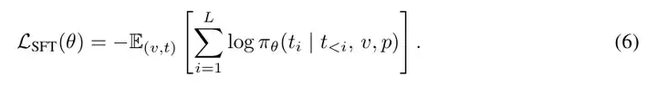 基于语言的监督微调(SFT)。在该对比方法中,规划任务被构建于语言模态中。与生成图像形式的中间状态不同,模型需生成动作序列的文本描述。形式上,给定输入视觉状态 v 及任务描述文本提示 p,模型被训练以输出一个动作序列 t = (t₁, ..., t_L),其中每个 token tᵢ ∈ V_text 表示一个动作。模型输入为提示词 token 与视觉 token 的拼接,目标为对应的文字动作序列。研究团队采用此前在自回归模型中常用的监督微调方法,通过最小化交叉熵损失来学习动作预测: