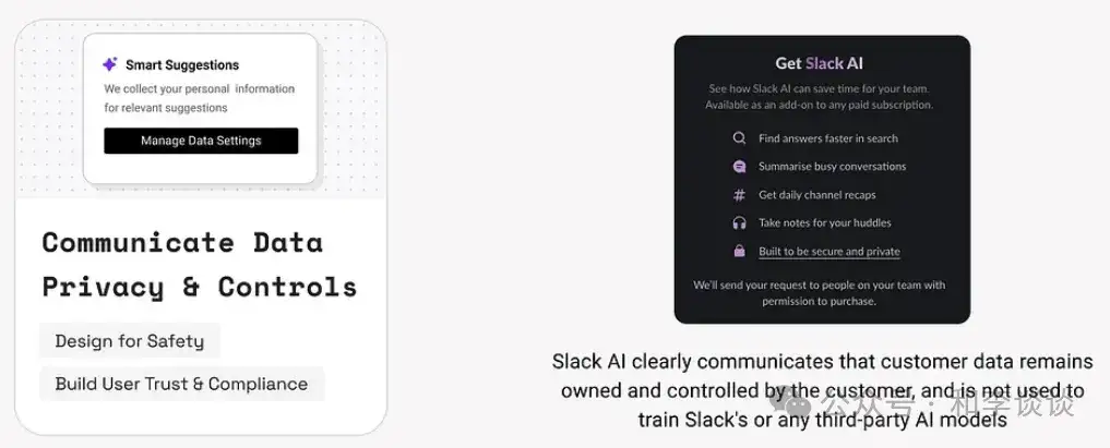 GenAI 系统通常依赖于敏感数据、情境数据或行为数据,处理不当可能会导致用户不信任、带来法律风险或意外滥用等问题。清晰地传达隐私保护措施有助于给用户带来安全感、受遵重感和对全局的掌控感。例如,Slack AI 明确表示,客户数据仍归客户所有并控制,而不会用于训练 Slack 或任何第三方 AI 模型。(参考阅读:https://slack.com/intl/en-in/blog/news/how-slack-protects-your-data-when-using-machine-learning-and-ai)