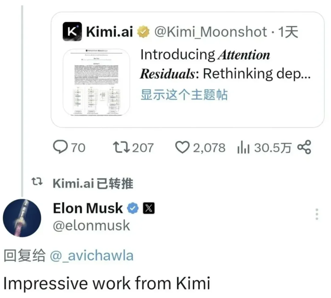 前几天,一篇来自Kimi的论文「ATTENTION RESIDUALS」在 AI 圈引发了激烈讨论——马斯克罕见地发出评价:"Impressive work from Kimi"。