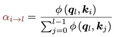 为了解决标准残差每层贡献权重均等带来的问题,本文提出了「全注意力残差」的机制,即把每层的贡献添加权重,让更重要的层具备更强的表示能力。这里依然v代表每一层的变换结果f(h),v0就是原始embedding后的结果用于模型输入,即h1。每一层输入隐状态公式如下: